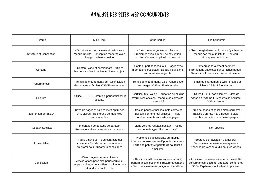 Après avoir analysé les concurrents de Josué, j'ai regroupé et séparé les éléments en différentes catégories (Structure et Conception, Contenu, Performances, Sécurité, SEO, Réseaux Sociaux, Accessibilité). Le tableau à droite vous présente un récapitulatif des informations essentielles que j'ai considérées pour comparer les sites concurrents à mon travail.