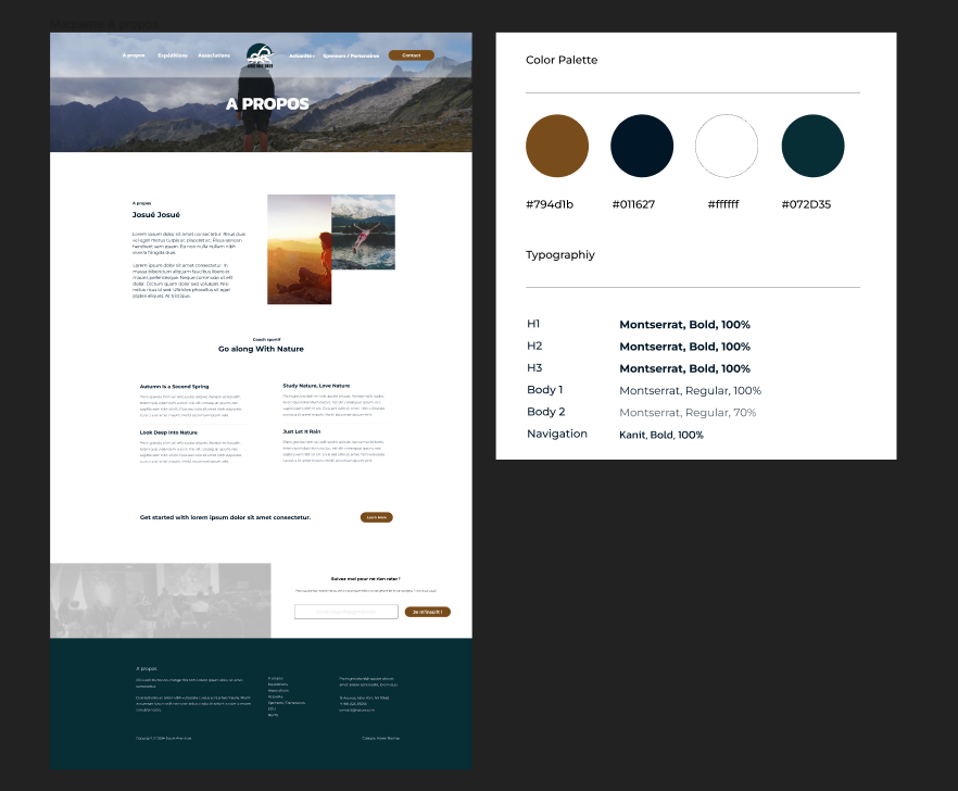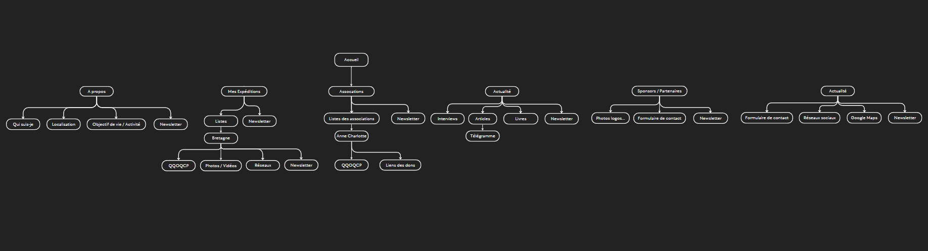 J'ai initialement conçu 7 pages (À propos, Expéditions, Défis, Associations, Actualité, Sponsors/Partenaires et Contact) qui incluent toutes les différentes catégories.