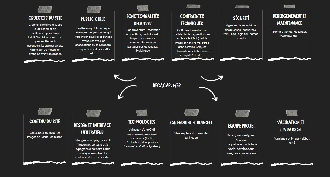 Après plusieurs rendez-vous client j'ai fait un récapitulatif du cahier des charges web qui me sera nécessaire pour la réalisation des maquettes.
